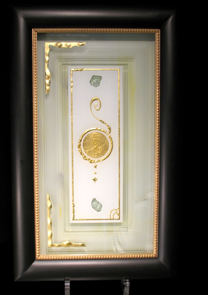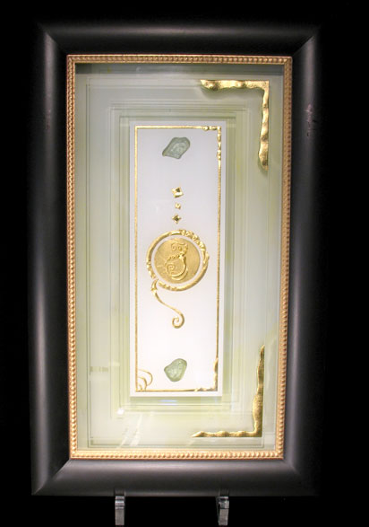 The gilding of glass in combination with his deep sandblasting is the most outstanding distinguishing feature of glass artist Jens Banerjee, for which he was awarded the "Deutscher Innovationspreis" (German Prize of Innovation) by the "Bundesverband der Deutschen Glasveredler" (German association of craftsmen and artists specialized in glass refinement). With a leaf gilding of 24-carat gold the glass refinement, an impressive process in itself, receives exactly the rank of quality that makes his glass refinement in combination with deep sandblasting unique.