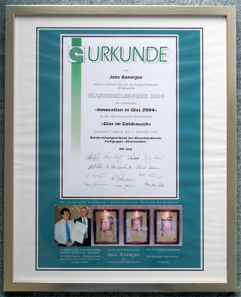 For his exceptional refinement of glass in combination with leaf gilding Jens Banerjee was awarded the "Deutscher Innovationspreis" (German Prize of Innovation) by the "Bundesverband der Deutschen Glasveredler" (German association of craftsmen and artists specialized in glass refinement).