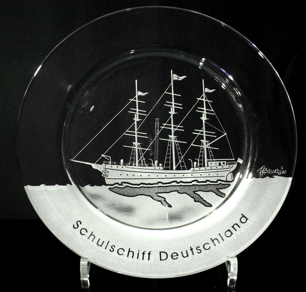 Here the glass designer's particularity is his manner of glass refinement in combination with other precious materials. Having three different professions and thus being able to work as a cabinet maker and pattern maker, as a specialist for glass refinement, and as a glass artist he combines these three professions of his with immense ingenuity, professionalism, and flexibility.